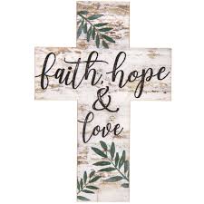 A faith, hope & lovecross with text from the bible passage corinthians 13:13.